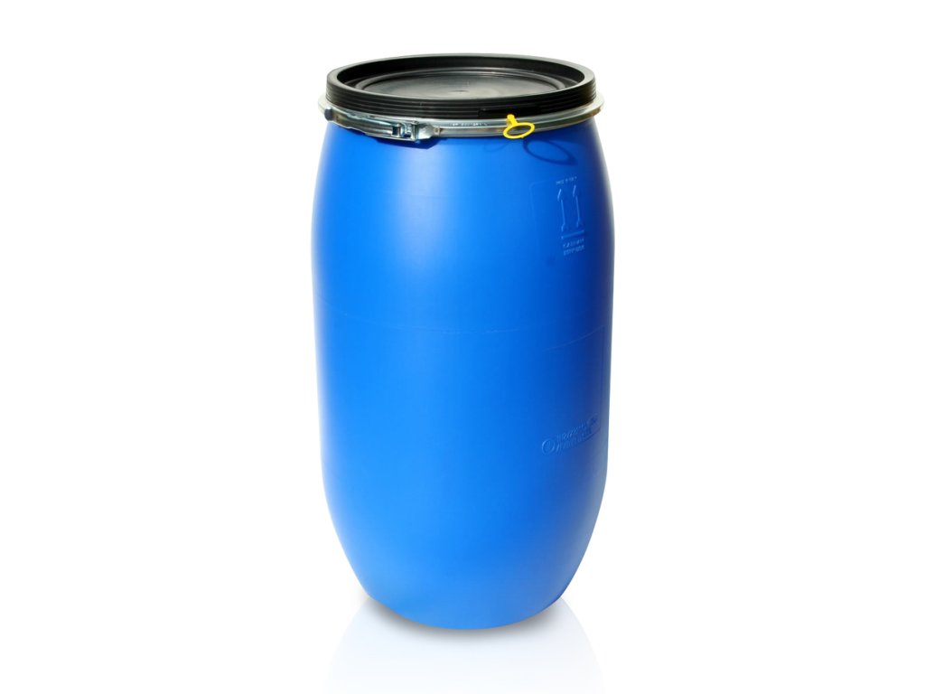 Kunststofffass mit Spannring, geeignet für den Transport und die Lagerung von Schüttgütern und Flüssigkeiten sowie von gefährlichen Stoffen.