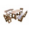 Gartenmöbel aus Agatholz, das sehr hart und wetterbeständig ist. Kann unbehandelt (Tisch + 2 Bänke) oder lackiert erworben werden.
