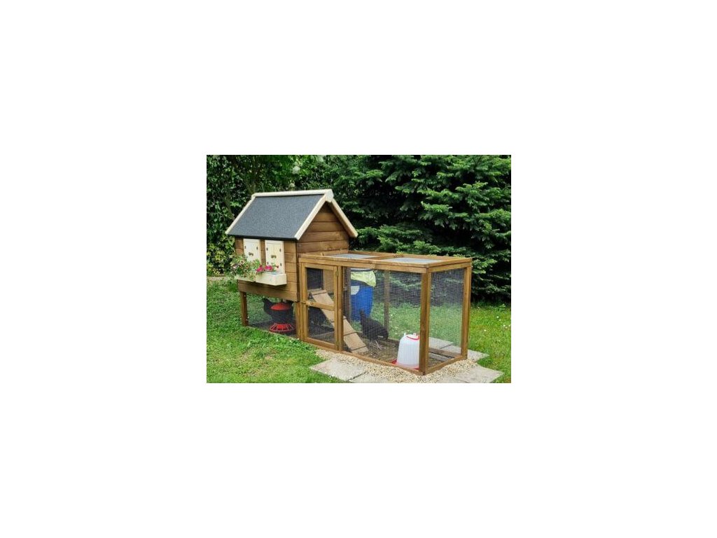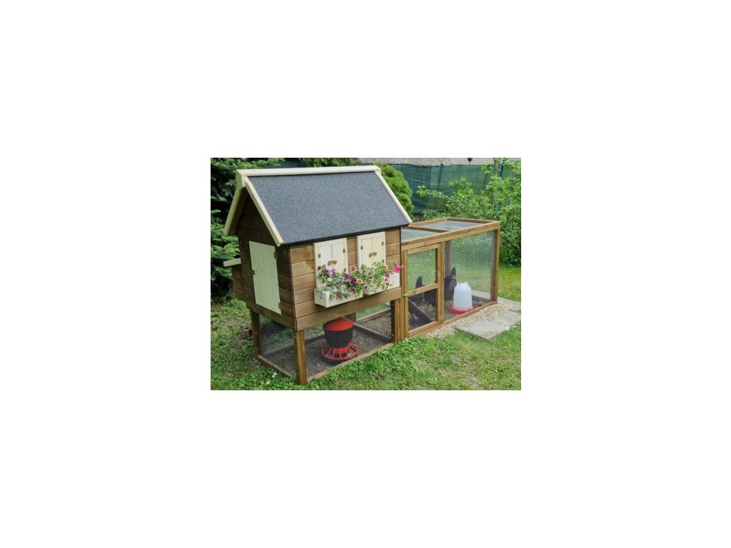 Dicke der Bretter 20 mm, verzinkter Drahtzaun, ausziehbare Schublade, klappbares Dach. Der Hühnerstall hat 2 Fenster mit Blumenkästen, in die Sie Blumen pflanzen können, um Ihren Garten zu verschönern.