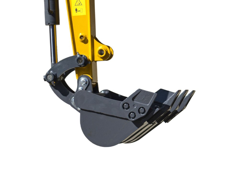 Der Minibagger ist standardmäßig mit einem 38-cm-Löffel ausgestattet. Wenn die Kabine entfernt ist, kann er sich auch in einem Gebäude bewegen und passt problemlos durch Türen. Er kann eine große Hilfe sein, zum Beispiel beim Einsatz eines Presslufthammers oder beim Transport von Materialien hinein und hinaus.