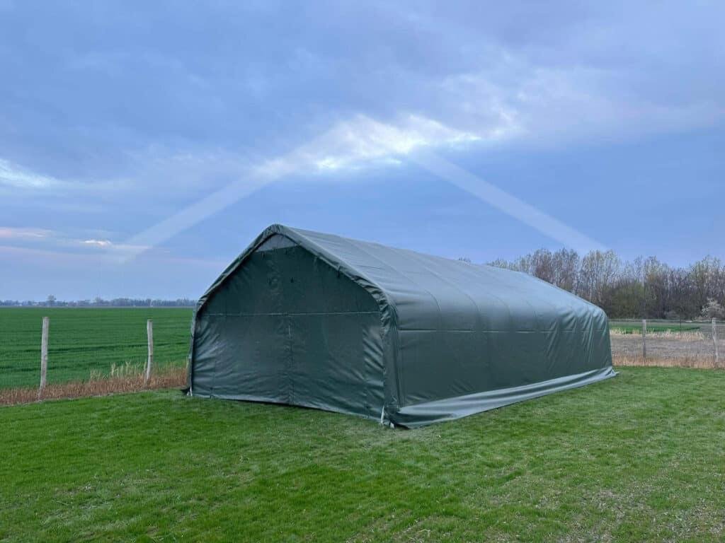 Robuste Lagerhalle mit PVC-Plane (UV-beständig, wasserdicht) und feuerverzinkter Stahlkonstruktion. Beidseitig öffnende Eingänge. Bodenanker für unbefestigten Untergrund im Lieferumfang.
