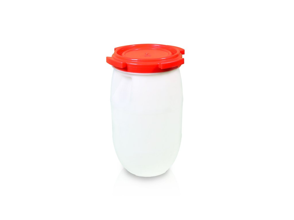 Hygienisch einwandfreie Kunststofffässer mit Griffen und Schraubdeckel.