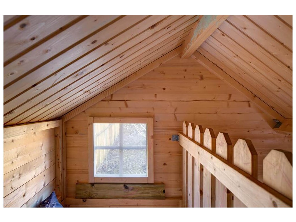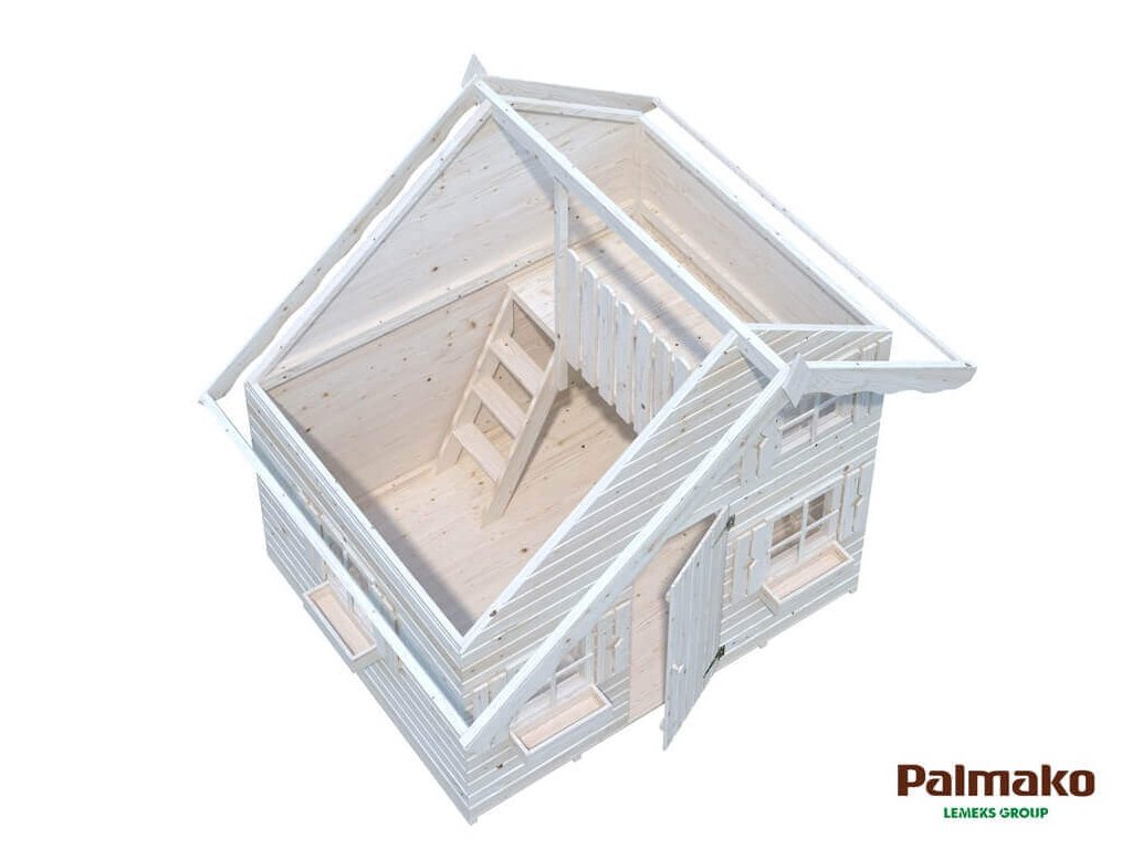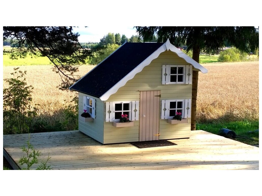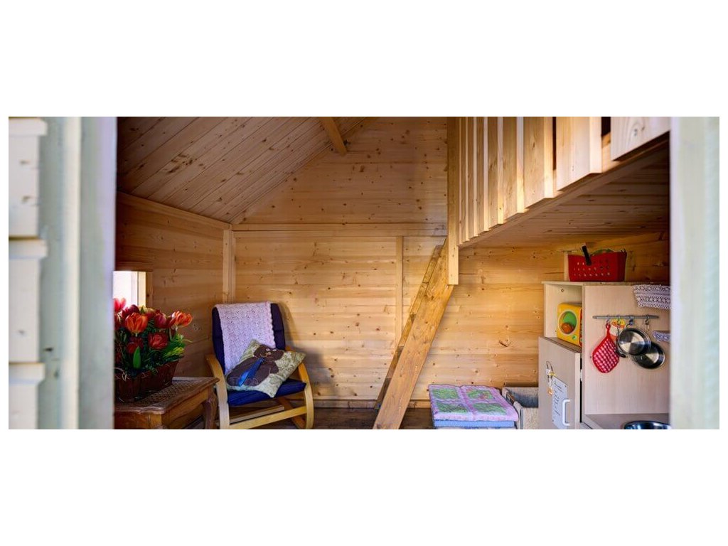 Das Kinder-Spielhaus Tom ist ein zweistöckiges Gartenhaus, in dem Kinder ihr eigenes „kleines Zuhause“ haben. Der Wohnbereich ist in Erdgeschoss und Dachboden unterteilt, das obere Stockwerk ist über eine Leiter erreichbar.