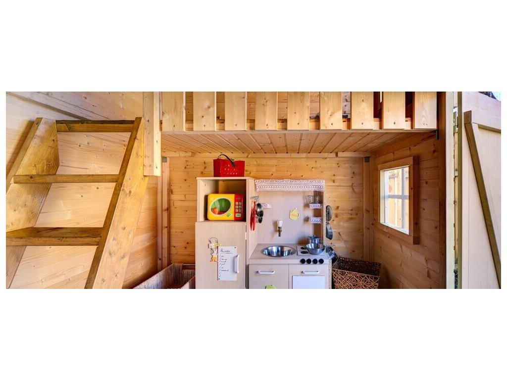 Die stabile Konstruktion bietet ausreichend Platz zum Spielen, Schutz vor der Sonne sowie die Möglichkeit für ein kleines „Nachtcamp“ im Sommer.